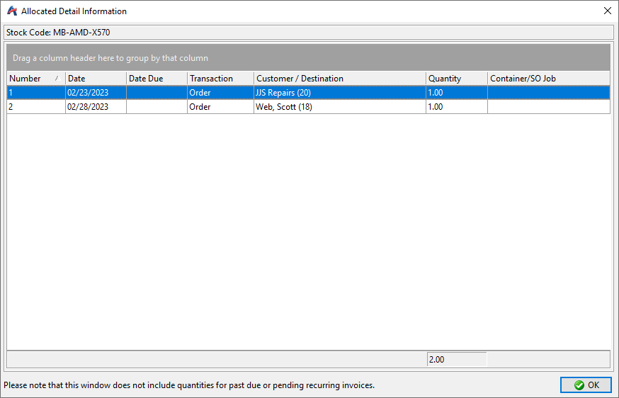 Knowledge is power, and Atrex gives you the power you need. The stock code selection window allows you to right click on an item and view detailed information regarding the quantities required to fill open orders and service orders, how many are currently on RMA to your suppliers, and how many you have on order as well as when you can expect the item. You can even print and edit most transactions directly from the detail information window. |