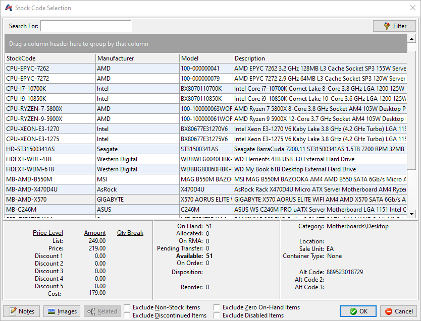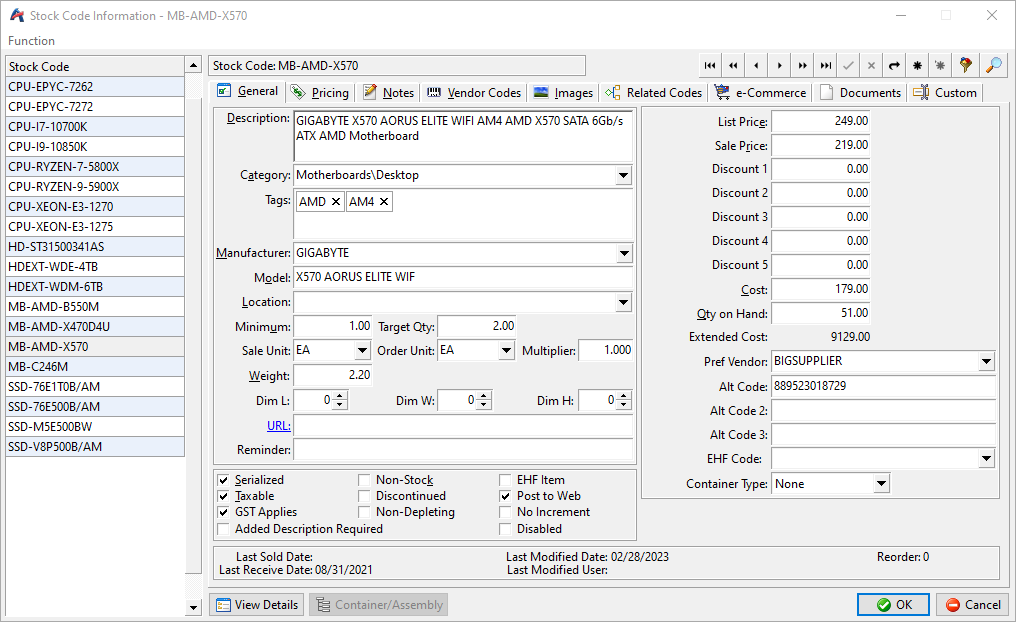All of the critical information required for a stock code is neatly organized on a single window. This allows you to modify the description, prices, cost, and on-hand quantities from just one place. Automatic pricing setup, item notes, vendor codes, related items, and image information is only a click away.