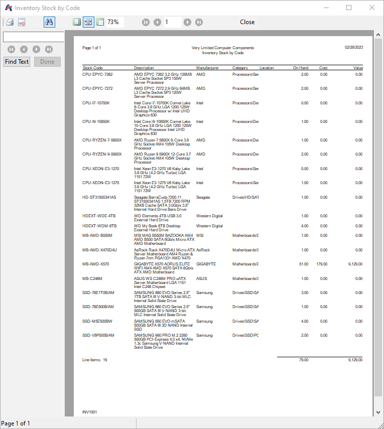 In addition to direct entry, all customers, stock codes, vendors, and transactions can be retrieved by way of a selection window. This allows for fast, accurate selection of items when you don't know the exact information that you are looking for. |
